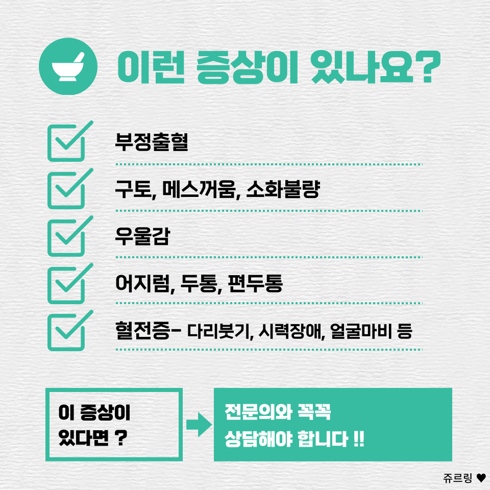 위와 같은 부작용들이 있는데 이 때는 다른 피임법을 병행하거나 꼭 해당 전문의에게 상담해야 해요 !